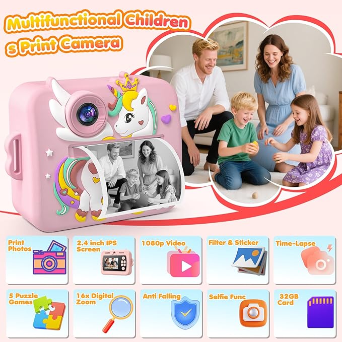 Kids Camera Instant Print, Front Rear Dual Selfie Kids Camera with 1080P Videos